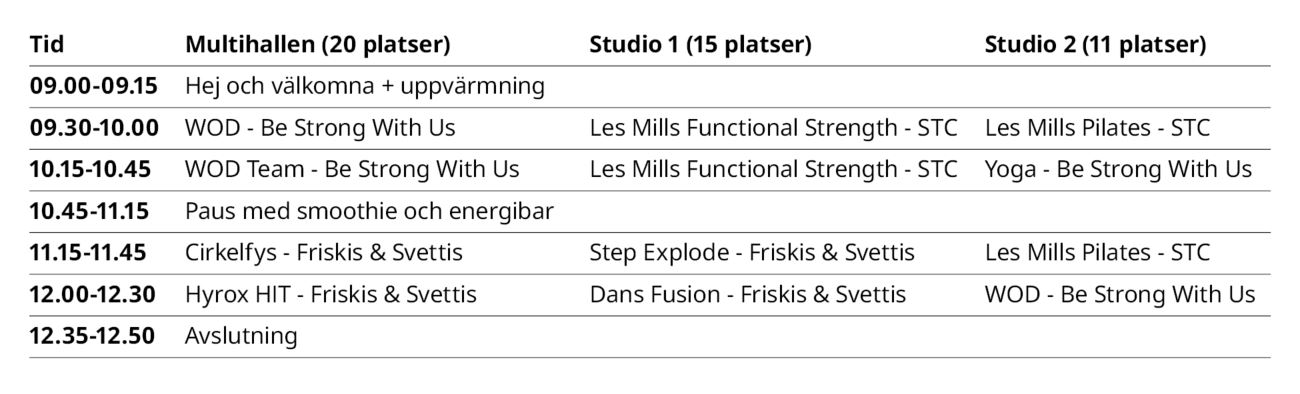 During the training day you can try the following sessions: Cirkelfys, Hyrox HIT, Dans Fusion, Step Explode, WOD, WOD Team, Yoga, Les Mills Functional Strength and Les Mills Pilates.